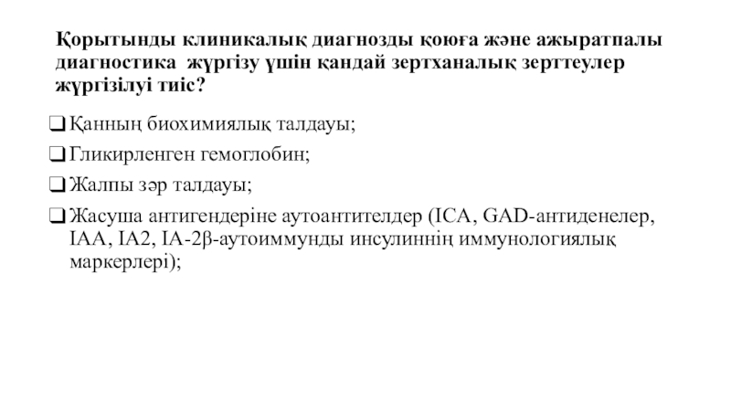 Слайд 9Қорытынды клиникалық диагнозды қоюға және ажыратпалы диагностика жүргізу үшін қандай зертханалық