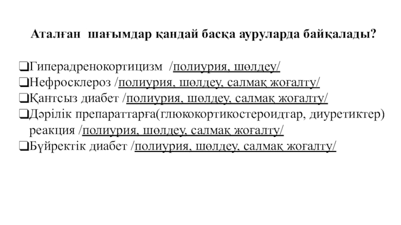 Бүйректік диабет /полиурия, шөлдеу, салмақ жоғалту/