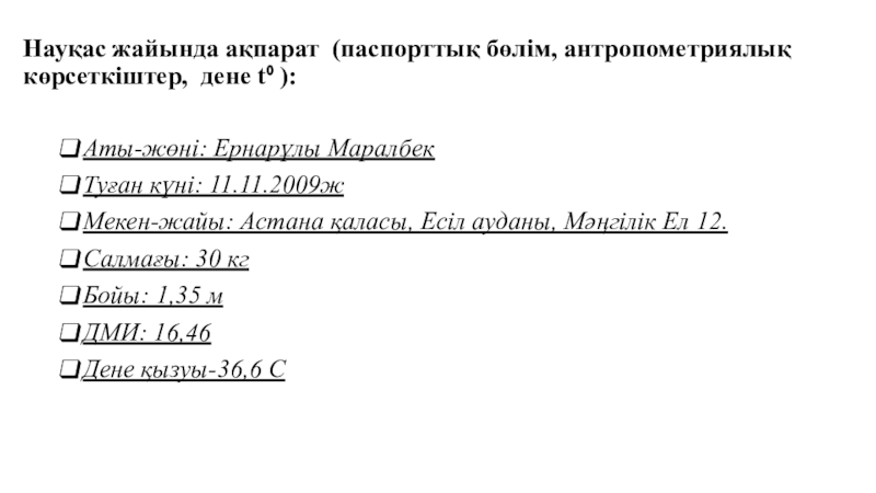 Слайд 3Науқас жайында ақпарат (паспорттық бөлім, антропометриялық көрсеткіштер, дене t⁰ ):