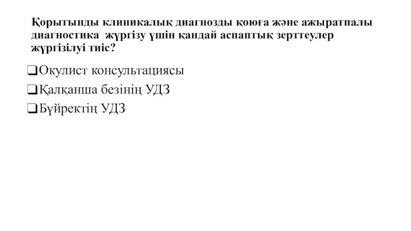 Слайд 11Қорытынды клиникалық диагнозды қоюға және ажыратпалы диагностика жүргізу үшін қандай аспаптық