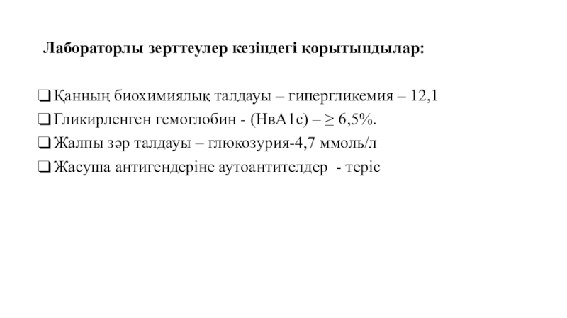 Зертханалық және аспаптық зеттеулер нәтижелері бойынша (гипергликемиялық синдром) науқасқа қойылатын қорытынды клиникалық диагноз: ҚД 1 тип.