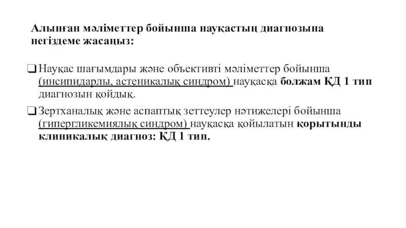 Слайд 13Алынған мәліметтер бойынша науқастың диагнозына негіздеме жасаңыз:
