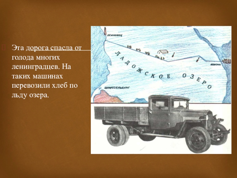 Эта дорога спасла от голода многих ленинградцев. На таких машинах перевозили хлеб по льду озера.