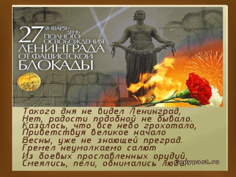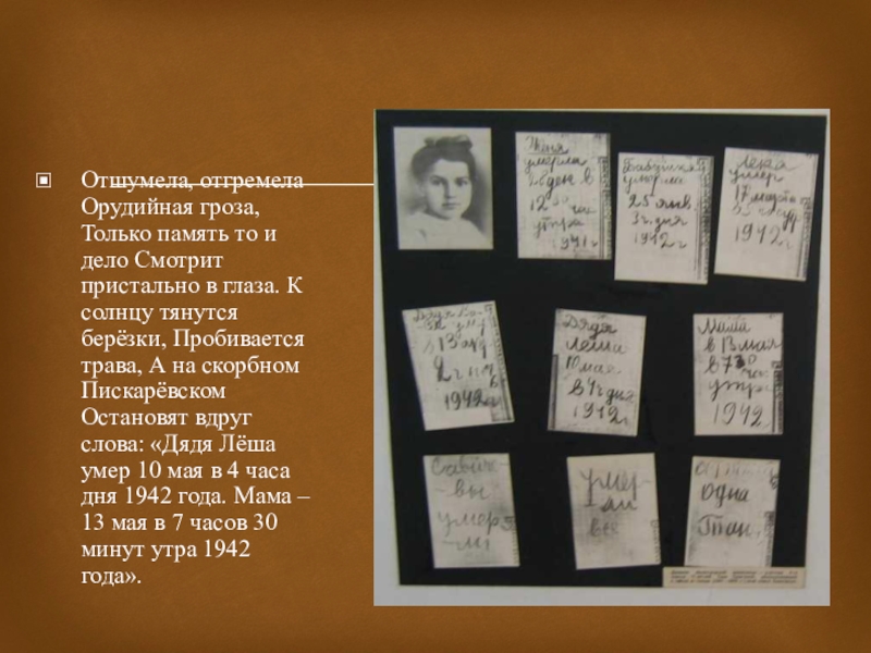 в глаза. К солнцу тянутся берёзки, Пробивается трава, А на скорбном Пискарёвском Остановят вдруг слова: «Дядя Лёша умер 10 мая в 4 часа дня 1942 года. Мама – 13 мая в 7 часов 30 минут утра 1942 года».
