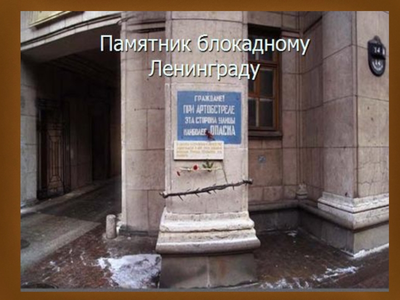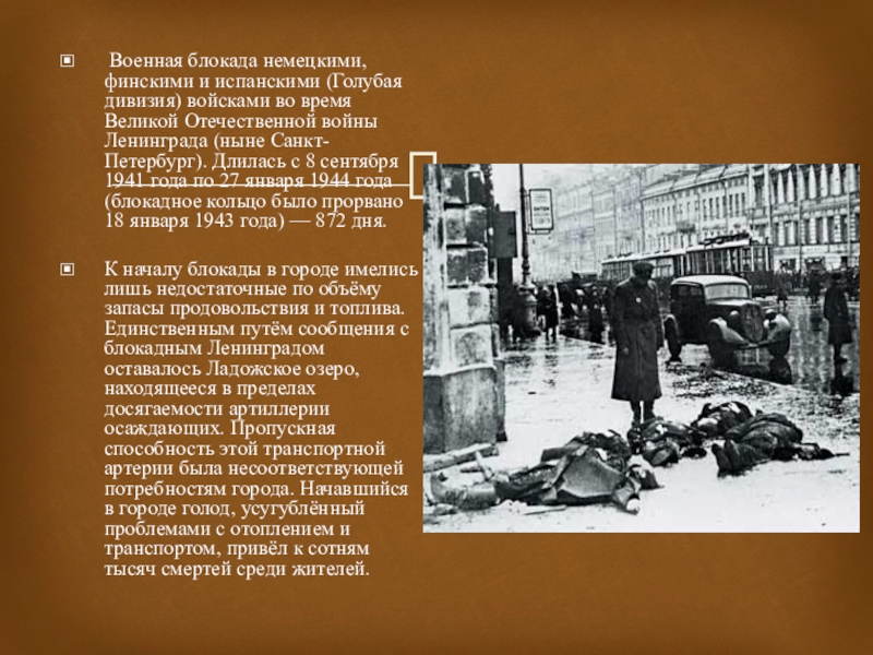 Военная блокада немецкими, финскими и испанскими (Голубая дивизия) войсками во время Великой Отечественной войны Ленинграда (ныне Санкт-Петербург). Длилась с 8 сентября 1941 года по 27 января 1944 года (блокадное кольцо было прорвано 18 января 1943