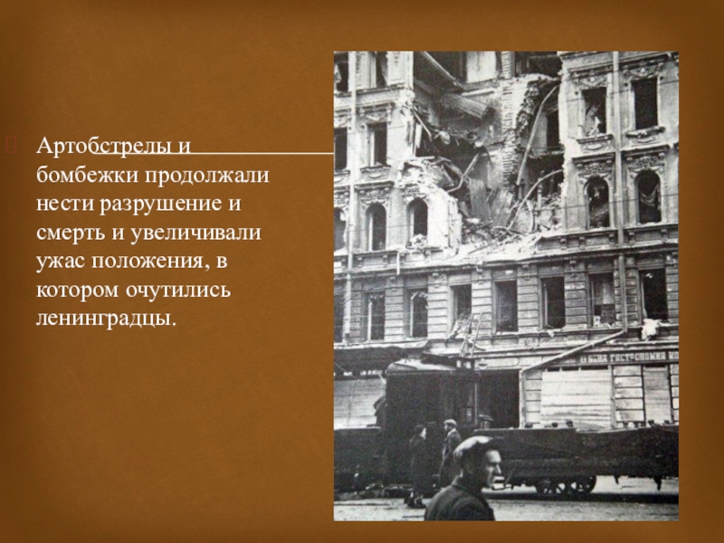 Артобстрелы и бомбежки продолжали нести разрушение и смерть и увеличивали ужас положения, в котором очутились ленинградцы.