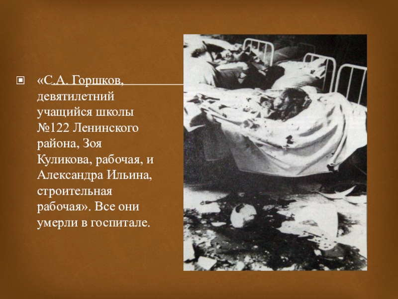 «С.А. Горшков, девятилетний учащийся школы №122 Ленинского района, Зоя Куликова, рабочая, и Александра Ильина, строительная рабочая». Все