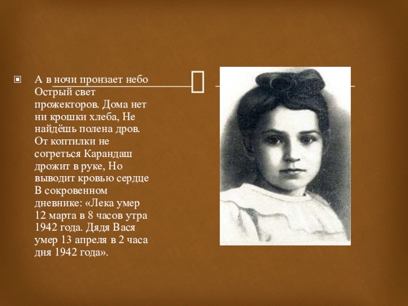 крошки хлеба, Не найдёшь полена дров. От коптилки не согреться Карандаш дрожит в руке, Но выводит кровью сердце В сокровенном дневнике: «Лека умер 12 марта в 8 часов утра 1942 года. Дядя Вася умер 13 апреля в 2 часа дня 1942 года».