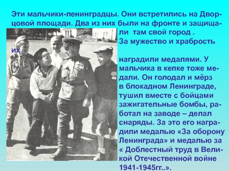 Слайд 73Эти мальчики-ленинградцы. Они встретились на Двор-