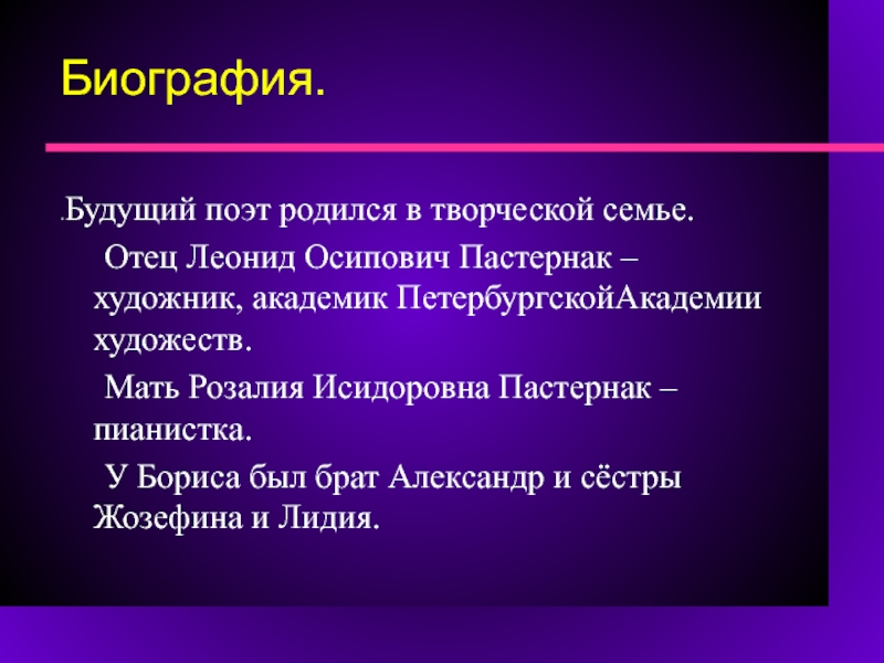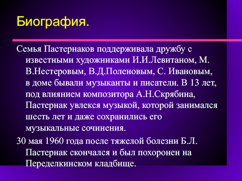 В 13 лет, под влиянием композитора А.Н.Скрябина, Пастернак увлекся музыкой.