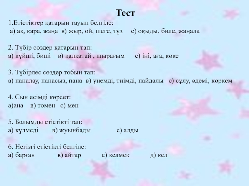 Тест 1.Етістіктер қатарын тауып белгіле: а) ақ, қара, жаңа в) жыр, ой, шеге, тұз с) оқыды, биле, жаңала 2. Түбір сөздер қатарын тап: а) күйші, биші в) қалқатай , шырағым с) іні, аға, көке 3. Түбірлес сөздер тобын тап: а) паналау, панасыз, пана в) үнемді, тиімді, пайдалы с) сұлу, әдемі, көркем 4. Сын есімді көрсет: а)ана в) төмен с) мен 5. Болымды етістікті тап: а) күлмеді в) жуынбады с) алды 6. Негізгі етістікті белгіле: а) барған в) айтар с) келмек д) кел