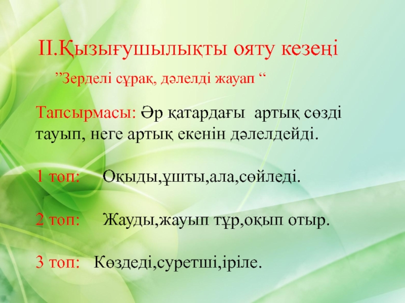 ІІ.Қызығушылықты ояту кезеңі   ”Зерделі сұрақ, дәлелді жауап “Тапсырмасы: Әр қатардағы артық сөзді тауып, неге артық
