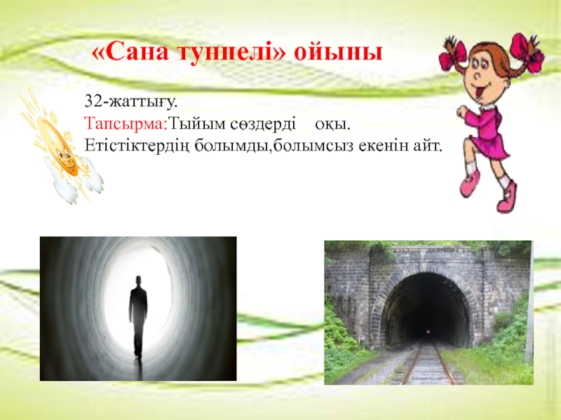«Сана туннелі» ойыны  32-жаттығу.Тапсырма:Тыйым сөздерді  оқы.Етістіктердің болымды,болымсыз екенін айт.