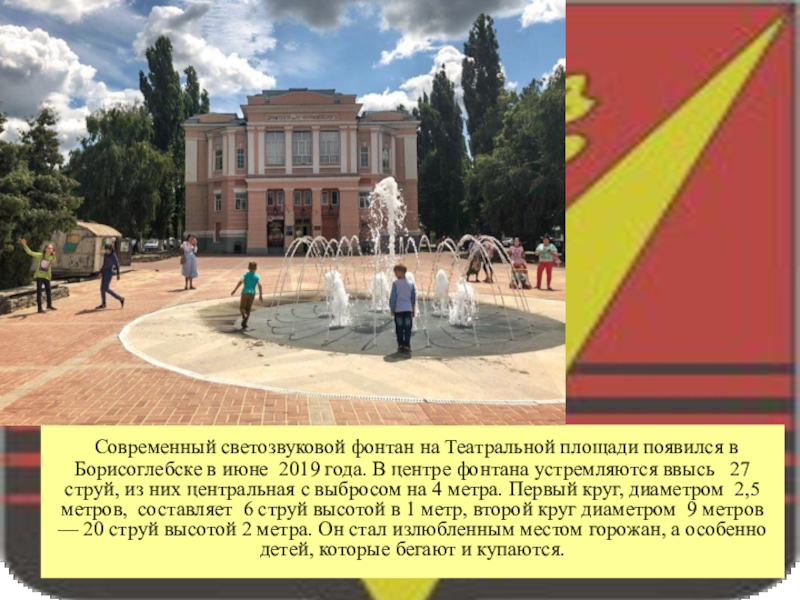 Слайд 13 Современный светозвуковой фонтан на Театральной площади появился в Борисоглебске в