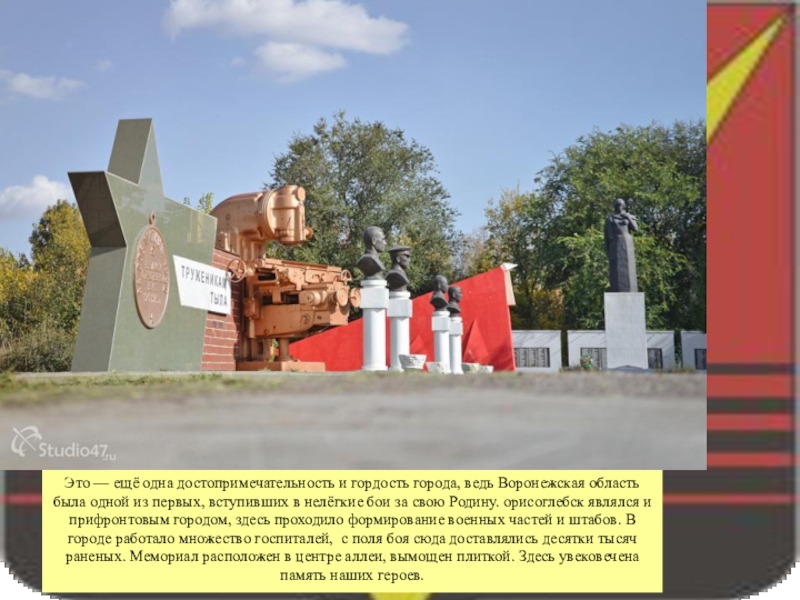 была одной из первых, вступивших в нелёгкие бои за свою Родину. орисоглебск являлся и прифронтовым городом, здесь проходило формирование военных частей и штабов. В городе работало множество госпиталей, с поля боя сюда доставлялись десятки тысяч раненых. Мемориал расположен в центре аллеи, вымощен плиткой. Здесь увековечена память наших героев.