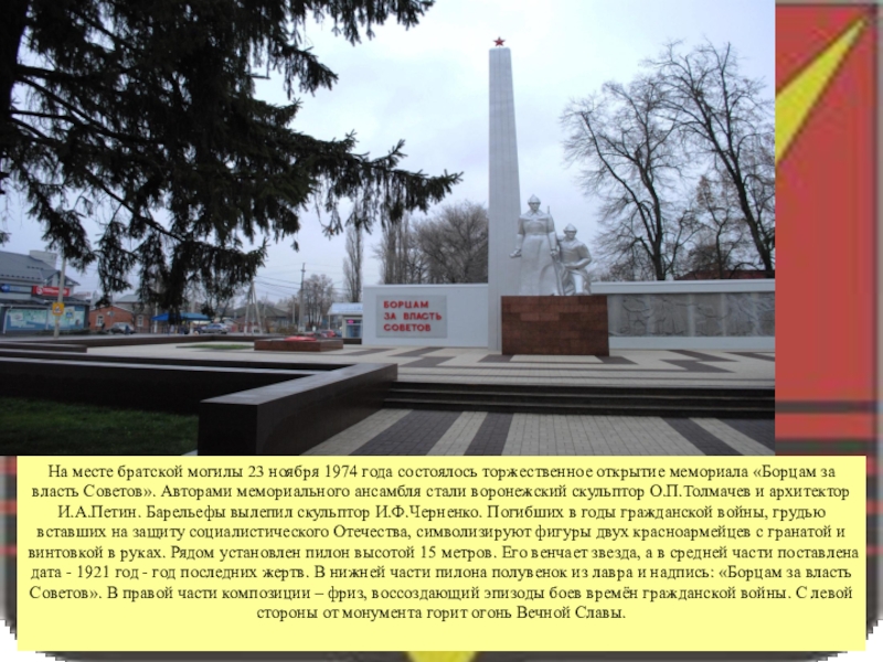 мемориала «Борцам за власть Советов». Авторами мемориального ансамбля стали воронежский скульптор О.П.Толмачев и архитектор И.А.Петин. Барельефы вылепил скульптор И.Ф.Черненко. Погибших в годы гражданской войны, грудью вставших на защиту социалистического Отечества, символизируют фигуры двух красноармейцев с гранатой и винтовкой в руках. Рядом установлен пилон высотой 15 метров. Его венчает звезда, а в средней части поставлена дата - 1921 год - год последних жертв. В нижней части пилона полувенок из лавра и надпись: «Борцам за власть Советов». В правой части композиции – фриз, воссоздающий эпизоды боев времён гражданской войны. С левой стороны от монумента горит огонь Вечной Славы.