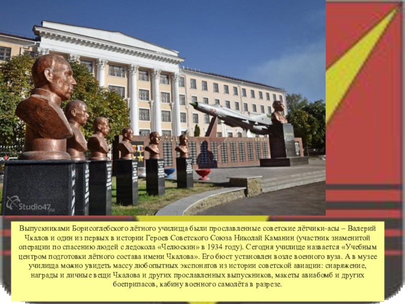 Слайд 9Выпускниками Борисоглебского лётного училища были прославленные советские лётчики-асы – Валерий Чкалов