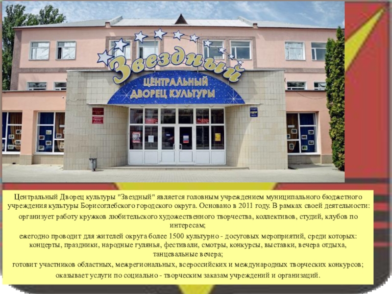 Слайд 10Центральный Дворец культуры "Звездный" является головным учреждением муниципального бюджетного учреждения культуры