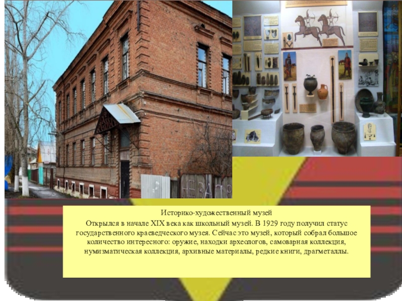 году получил статус государственного краеведческого музея. Сейчас это музей, который собрал большое количество интересного: оружие, находки археологов, самоварная коллекция, нумизматическая коллекция, архивные материалы, редкие книги, драгметаллы.