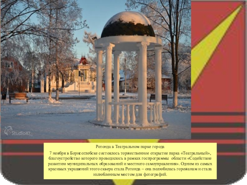 парка «Театральный», благоустройство которого проводилось в рамках госпрограммы области «Содействие развитию муниципальных образований и местного самоуправления». Одним из самых красивых украшений этого сквера стала Ротонда – она полюбилась горожанам и стала излюбленным местом для фотографий.