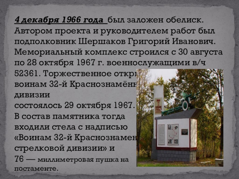 Шершаков Григорий Иванович. Мемориальный комплекс строился с 30 августа по 28 октября 1967 г. военнослужащими в/ч 52361. Торжественное открытие памятника воинам 32-й Краснознамённой стрелковой дивизии состоялось 29 октября 1967. В состав памятника тогда входили стела с надписью «Воинам 32-й Краснознаменной стрелковой дивизии» и  76 — миллиметровая пушка на  постаменте.