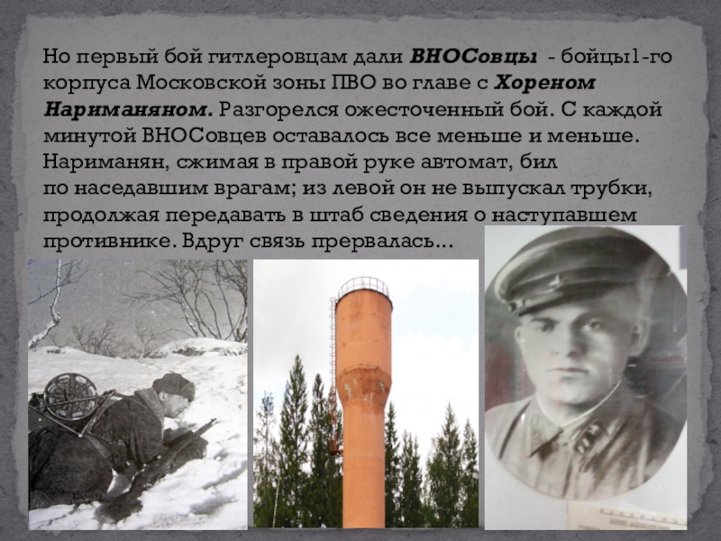 Но первый бой гитлеровцам дали ВНОСовцы - бойцы1-го корпуса Московской зоны ПВО во главе с Хореном Нариманяном. Разгорелся ожесточенный бой.