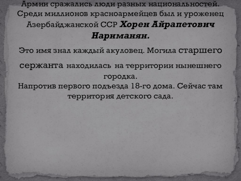 миллионов красноармейцев был и уроженец Азербайджанской ССР Хорен Айрапетович Нариманян. Это имя знал каждый акуловец. Могила старшего сержанта находилась на территории нынешнего городка. Напротив первого подъезда 18-го дома. Сейчас там территория детского сада.