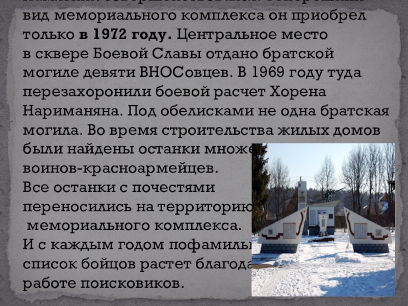 Слайд 10Памятник совершенствовался. Теперешний вид мемориального комплекса он приобрел только в 1972 году. Центральное место