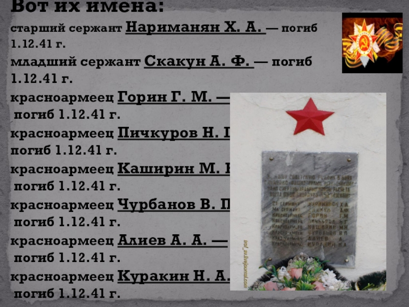 Слайд 7Вот их имена:  старший сержант Нариманян Х. А. — погиб 1.12.41 г. младший сержант Скакун А. Ф. — погиб