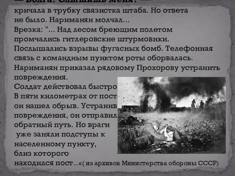 Слайд 5— Волга! Слышишь меня? —  кричала в трубку связистка штаба. Но ответа не было. Нариманян молчал... Врезка: