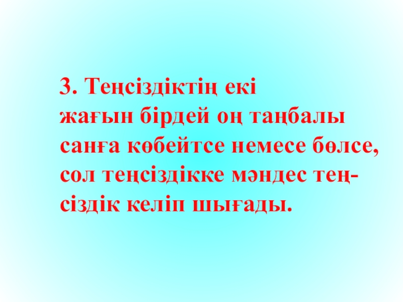 3. Теңсіздіктің екіжағын бірдей оң таңбалысанға көбейтсе немесе бөлсе,сол теңсіздікке мәндес тең-сіздік келіп шығады.