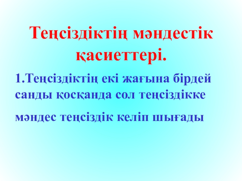 Теңсіздіктің мәндестік қасиеттері.1.Теңсіздіктің екі жағына бірдей санды қосқанда сол теңсіздіккемәндес теңсіздік келіп шығады