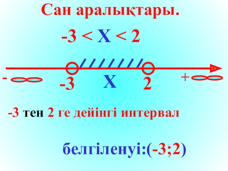 Сан аралықтары.-3 < X < 2-32X-3 тен 2 ге дейінгі интервал белгіленуі:(-3;2)