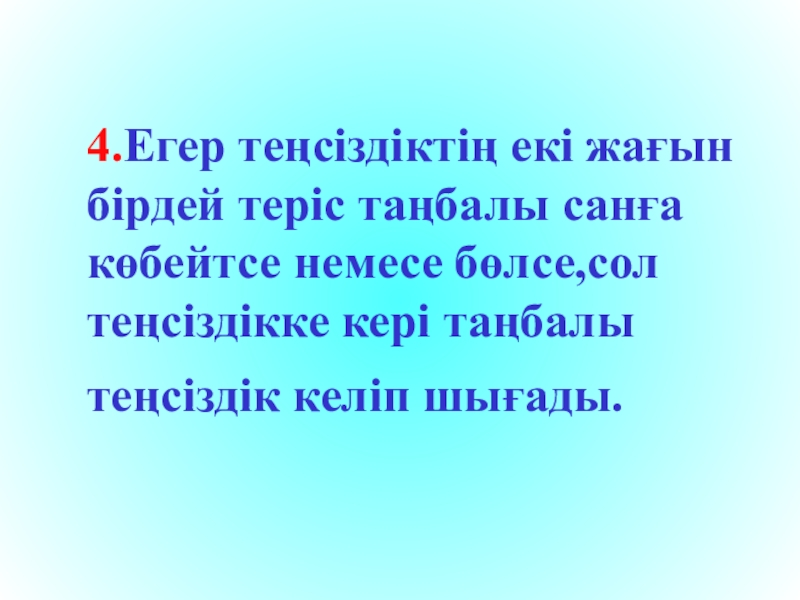 4.Егер теңсіздіктің екі жағынбірдей теріс таңбалы санғакөбейтсе немесе бөлсе,сол теңсіздікке кері таңбалытеңсіздік келіп шығады.
