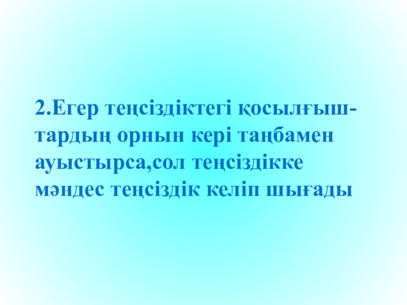 Слайд 6 2.Егер теңсіздіктегі қосылғыш- тардың орнын кері таңбамен ауыстырса,сол теңсіздікке мәндес теңсіздік