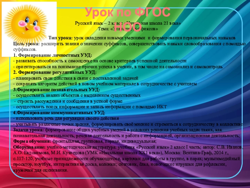 Оборудование: учебно-методическая литература: учебник «Русский язык» 2 класс I часть; автор: С.В. Иванов, А.О. Евдокимова, М.И. Кузнецова (УМК «Начальная школа ХХ1 века»), Москва: Вентана-Граф, 2014 г., с.117-120, учебные принадлежности обучающегося, карточки для работы в группе, в парах; мультимедийный проектор, ноутбук, интерактивная доска, колонки; снеговик, ёлка, новогодние игрушки для рефлексии, кружочки для оценивания.