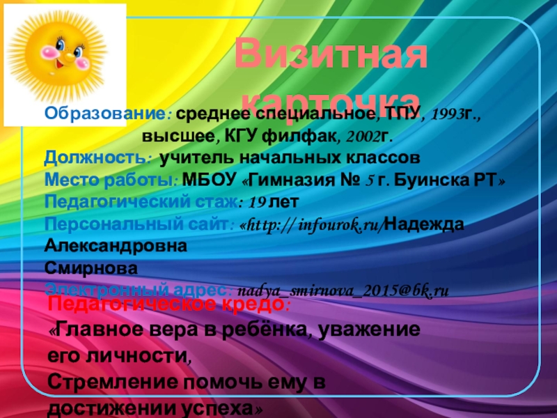 С раннего детства представляла себя в роли учителя, играла в роли учителя с младшими братьями. И с годами это представление не прошло. Особую симпатию проявляла к урокам литературы и русского языка. Очень интересны были уроки английского языка, биологии. Поэтому сразу после окончания школы поступила в педагогическое училище, затем в Казанский государственный университет на филологическое отделение. Так получилось, что мне пришлось перевестись учителем начальных классов, о чём нисколько не жалею. Мне доставляет огромное удовольствие делиться знаниями с моими учениками. Видеть собственными глазами их успехи и достижения.