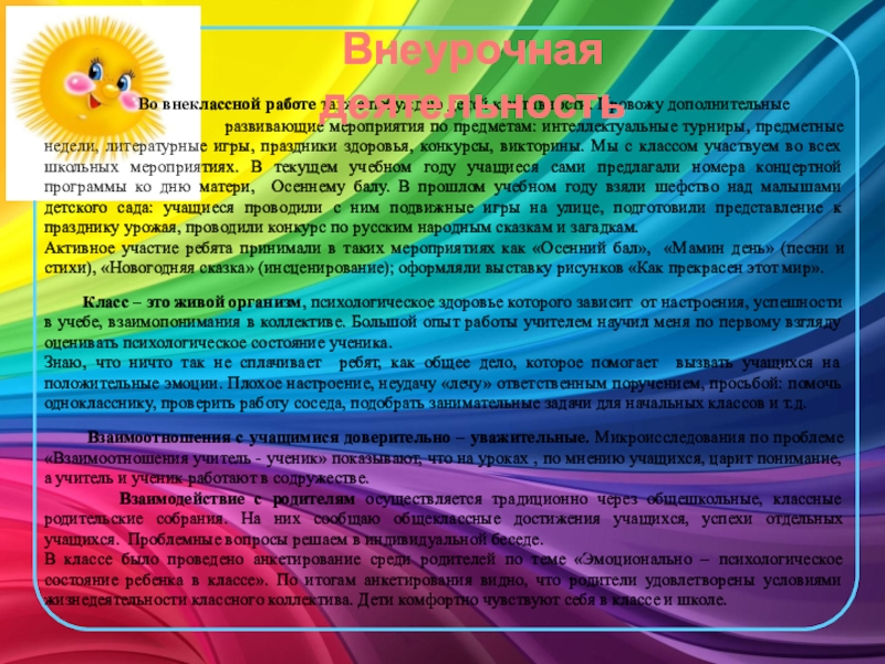 Класс – это живой организм, психологическое здоровье которого зависит от настроения, успешности в учебе, взаимопонимания в коллективе. Большой опыт работы учителем научил меня по первому взгляду оценивать психологическое состояние ученика.