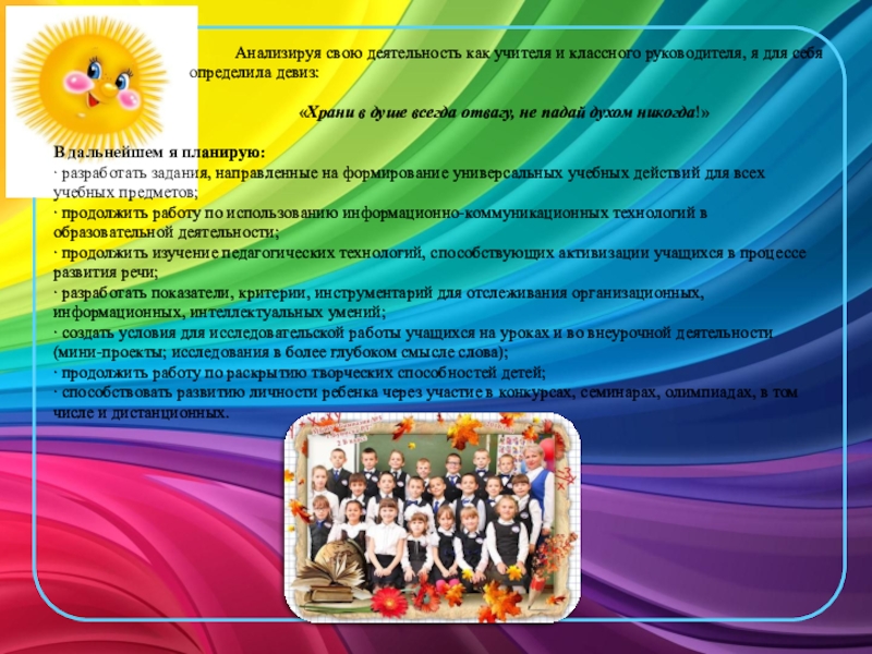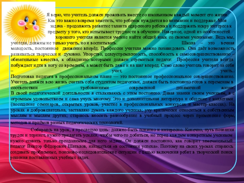 Как педагог, я нахожусь в постоянном профессиональном поиске. Как измерить работу учителя? Ведь он соприкасается с тонкой материей, которая называется человек, которая наиболее хрупкая и ранимая, особенно в детстве. Учитель – это духовный наставник. Каждый день, заходя в класс, я забочусь о своих маленьких «алмазах» и делаю это с улыбкой на лице. А где же черпать вдохновение? В самой себе, в детских глазах, смотрящих на тебя и выражающих целую гамму чувств.