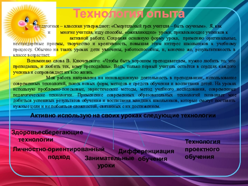 Собираясь на урок, я преследую цель: должно быть понятно и интересно. Конечно, путь познания труден и тернист, нужно прилагать усилия, чтобы чего-то добиться, но перед каждым конкретным учеником нужно ставить только преодолимые для него задачи. Он должен постоянно, как говорит замечательный педагог Виктор Фёдорович Шаталов, находиться «в состоянии успеха». Поэтому на своих уроках стараюсь создавать проблемные, поисково-исследовательские ситуации с целью включения ребят в творческий поиск решения поставленных учебных задач.