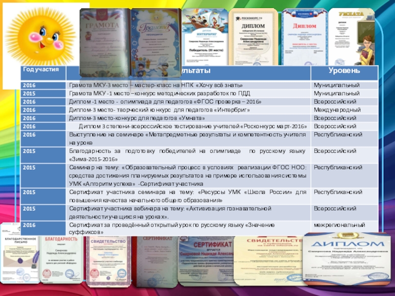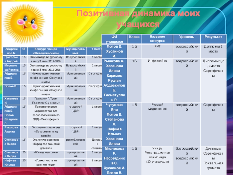 Положительные эмоции очень активно влияют на результативность моих ребят. Ученики моего класса являются участниками многих олимпиад и конкурсов различного уровня. В этом году много ребят приняло участие в международных конкурсах, метапредметной олимпиаде, но, к сожалению, не все результаты ещё пришли.