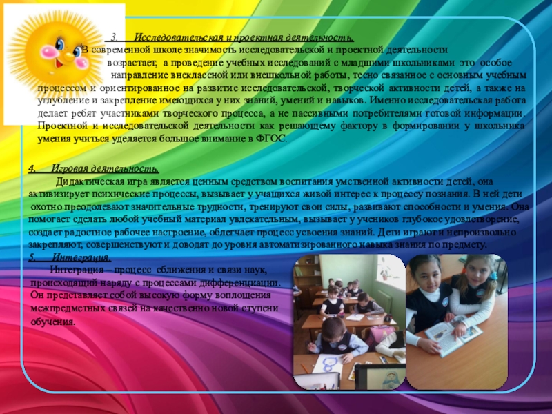 создает радостное рабочее настроение, облегчает процесс усвоения знаний. Дети играют и непроизвольно закрепляют, совершенствуют и доводят до уровня автоматизированного навыка знания по предмету.