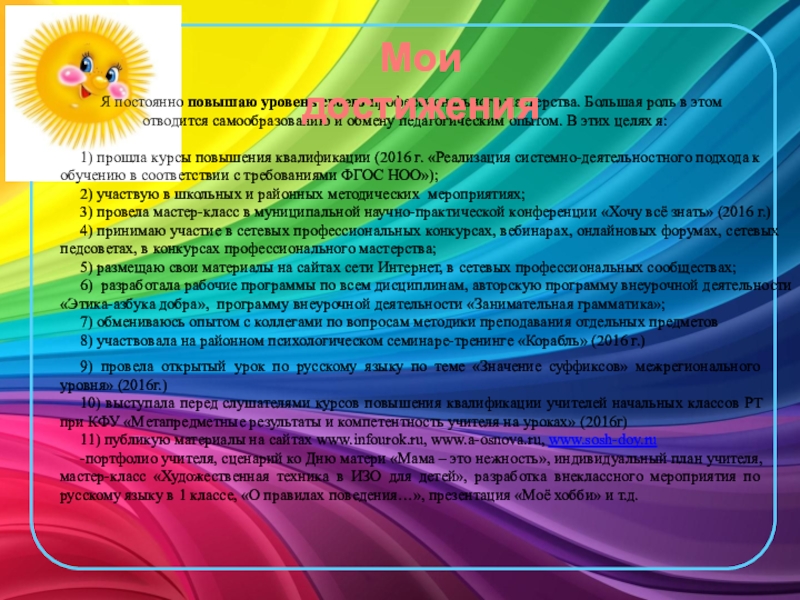 -портфолио учителя, сценарий ко Дню матери «Мама – это нежность», индивидуальный план учителя, мастер-класс «Художественная техника в ИЗО для детей», разработка внеклассного мероприятия по русскому языку в 1 классе, «О правилах поведения…», презентация «Моё хобби» и т.д.