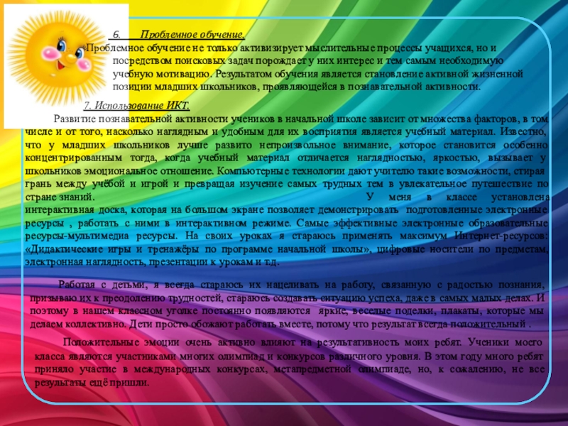 Развитие познавательной активности учеников в начальной школе зависит от множества факторов, в том числе и от того, насколько наглядным и удобным для их восприятия является учебный материал. Известно, что у младших школьников лучше развито непроизвольное внимание, которое становится особенно концентрированным тогда, когда учебный материал отличается наглядностью, яркостью, вызывает у школьников эмоциональное отношение. Компьютерные технологии дают учителю такие возможности, стирая