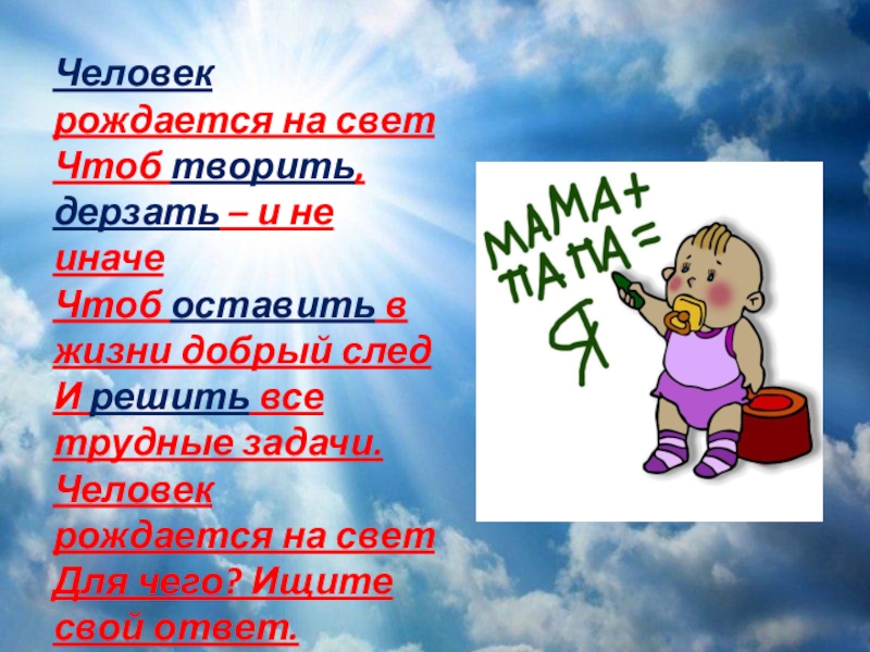 Это сайт презентаций, где можно хранить и обмениваться своими презентациями, докладами, проектами, шаблонами в формате PowerPoint с другими пользователями. Мы помогаем школьникам, студентам, учителям, преподавателям хранить и обмениваться учебными материалами.