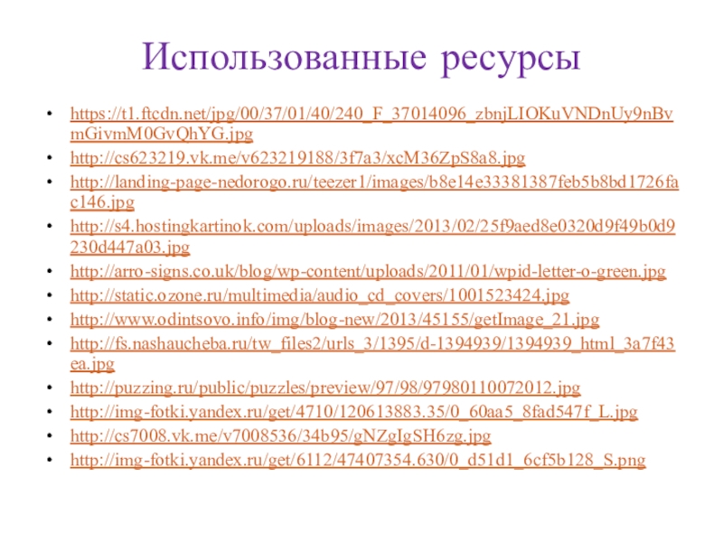 Использованные ресурсыhttps://t1.ftcdn.net/jpg/00/37/01/40/240_F_37014096_zbnjLIOKuVNDnUy9nBvmGivmM0GvQhYG.jpghttp://cs623219.vk.me/v623219188/3f7a3/xcM36ZpS8a8.jpghttp://landing-page-nedorogo.ru/teezer1/images/b8e14e33381387feb5b8bd1726fac146.jpghttp://s4.hostingkartinok.com/uploads/images/2013/02/25f9aed8e0320d9f49b0d9230d447a03.jpghttp://arro-signs.co.uk/blog/wp-content/uploads/2011/01/wpid-letter-o-green.jpghttp://static.ozone.ru/multimedia/audio_cd_covers/1001523424.jpghttp://www.odintsovo.info/img/blog-new/2013/45155/getImage_21.jpghttp://fs.nashaucheba.ru/tw_files2/urls_3/1395/d-1394939/1394939_html_3a7f43ea.jpghttp://puzzing.ru/public/puzzles/preview/97/98/97980110072012.jpghttp://img-fotki.yandex.ru/get/4710/120613883.35/0_60aa5_8fad547f_L.jpghttp://cs7008.vk.me/v7008536/34b95/gNZgIgSH6zg.jpghttp://img-fotki.yandex.ru/get/6112/47407354.630/0_d51d1_6cf5b128_S.png