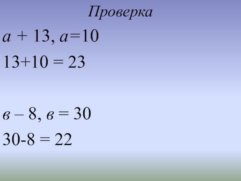Проверкаа + 13, а=1013+10 = 23 в – 8, в = 3030-8 = 22