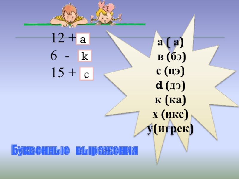 12 +    6 - 15 + akсБуквенные  выраженияа ( а) в (бэ) с