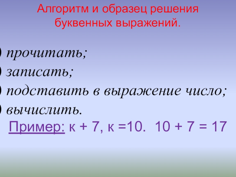 Алгоритм и образец решения буквенных выражений. прочитать; записать; подставить в выражение число; вычислить.Пример: к + 7, к