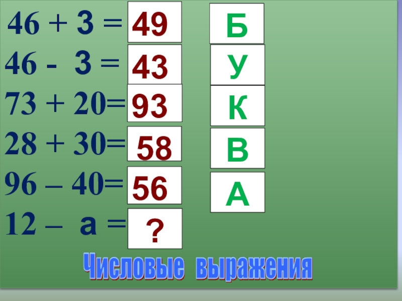 46 + 3 = 46 - 3 = 73 + 20= 28 + 30= 96 – 40=12 – а =?4393584956?БУКВА